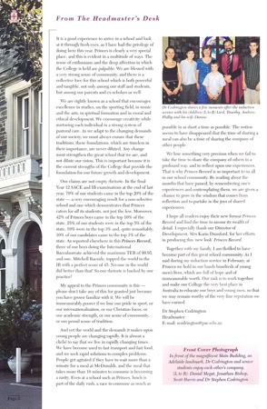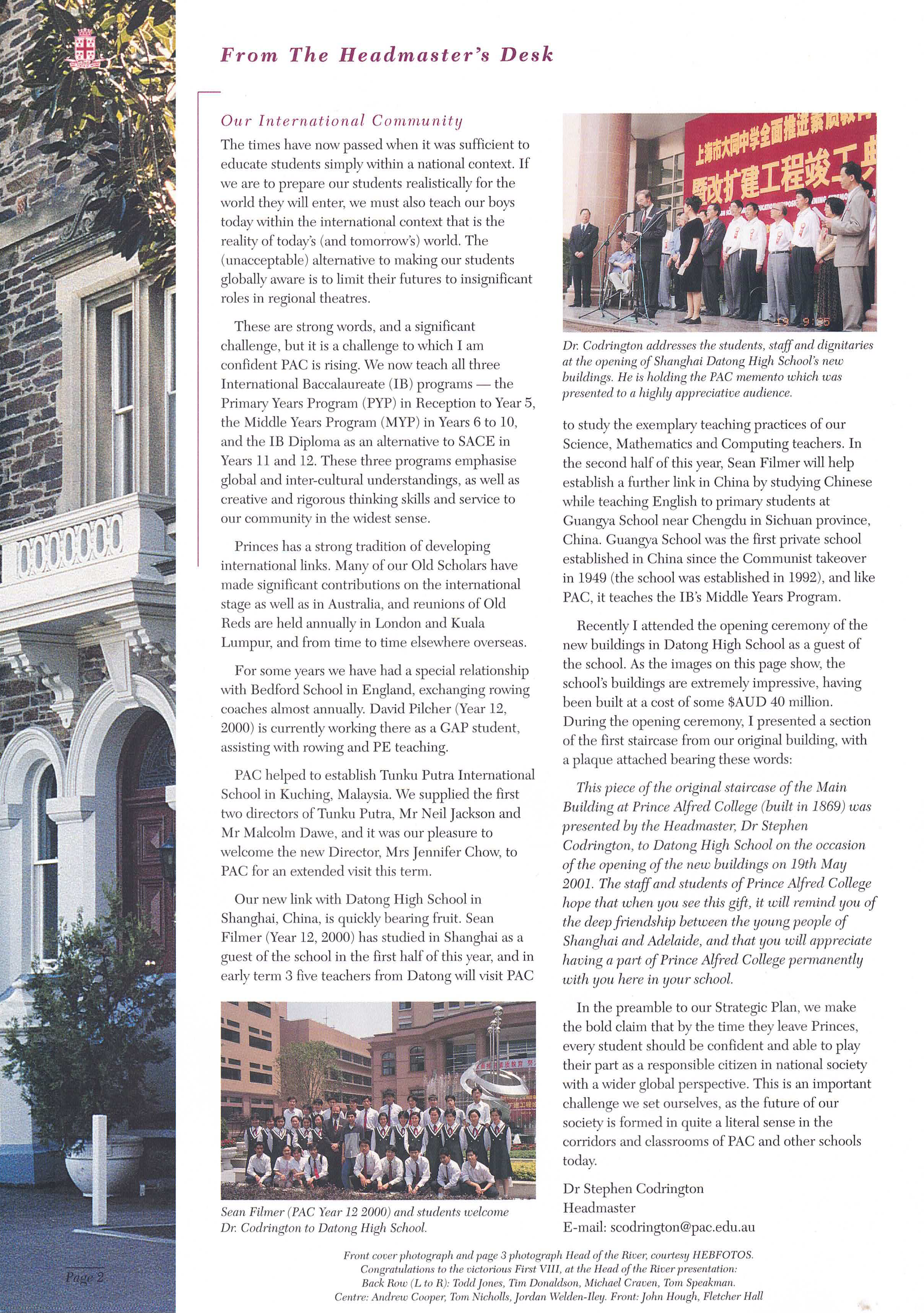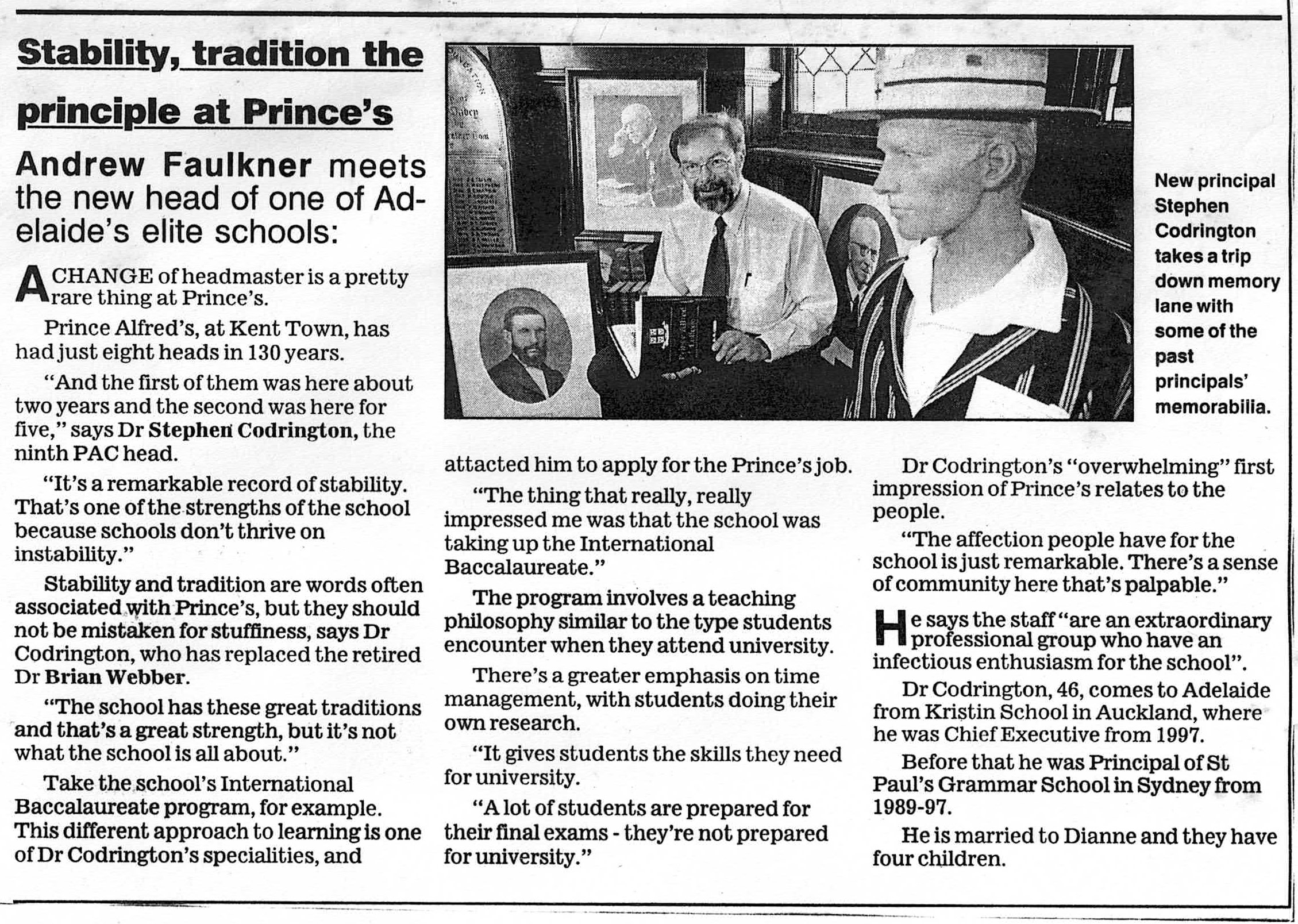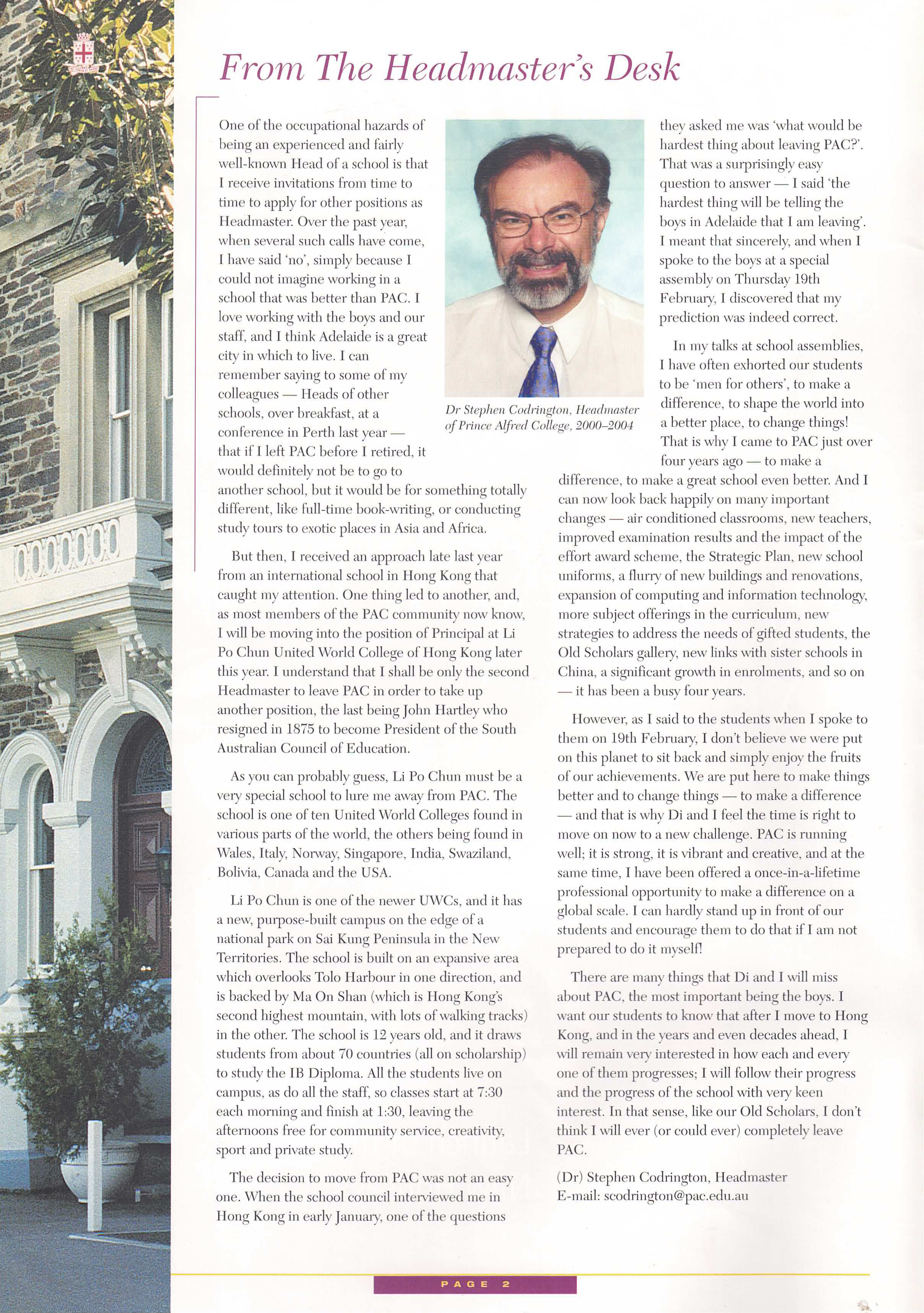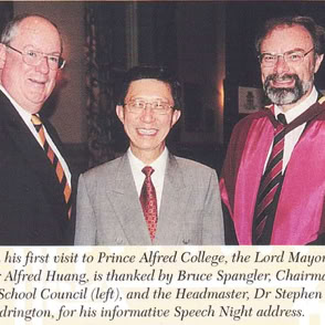 I was appointed as Prince Alfred College’s 9th Headmaster in late 1998, commencing duties on the first day of 2000. While at Prince Alfred College, one of Australia's most famous boys' schools (established in 1869), I oversaw a period of significant and rapid change. Many people would say this change was long overdue, dragging a somewhat conservative, inward-looking but well-meaning board and its excessively enmeshed finance staff out of the 20th into the 21st century. I was surprised by the poor state of many buildings (Library, Science Labs, Preparatory School) and educational shortcomings in the areas of limited languages program, anaemic support for the IB, no Gifted and Talented program, and sub-standard boarding facilities. One of my first initiatives was to commission the Milennium Hanging, a massive quilted hanging for the Hall that symbolised unity by assembling the handprint and signature of every student and staff member in the school on 1st January 2000. As soon as I arrived, I introduced a regular daily “Open Door” time for staff who were welcomed to come to my office unannounced to discuss any topic or question. I worked to build a strong relationship with PAOCA (Prince Alfred Old Collegians Association), travelling to attend almost every country and interstate reunion during my tenure as well as every one of the multiple reunions held in Adelaide. I oversaw three substantial building programs, upgraded classrooms (including introducing air conditioning), oversaw a complete re-fitting of the Hall with new seating, and played a pivotal role in developing the master plan which guided major campus redevelopment during the subsequent ten years. I diversified the staffing profile by appointing more young staff, including more women, and oversaw a much-needed growth in student enrolments of about 15% (Annual Reports show there were 909 students when I arrived in early 2000, 934 in early 2001, 952 in early 2002 and 963 in early 2003; by the end of 2003 there were 996 students). The strong growth of enrolments resulted from the appointment of an excellent new director in the Admissions Office who was supported by innovative marketing campaigns that controversially included television advertising and posters on bus shelters. I worked tirelessly to promote the College’s ethos as a Uniting Church school, including creating the new position of Youth Minister, through his weekly Newsletter articles, my public addresses and my weekly speeches at school assemblies. Always seeking to build new directions that authentically flowed from the College’s rich history and traditions, I actively ensured growth the School’s Archives facilities, developed a gallery called “Our Princes Men” in a high-traffic area of the school to celebrate the substantial achievements of alumni as role models to current students, initiated the Vintage Reds reunions to supplement the Old Old Boys annual assemblies, and commissioned historian and ex-student Ron Gibbs to update, expand and re-publish his 1984 “History of Prince Alfred College”. I promoted the school internationally, establishing a sister school relationship with Datong High School in Shanghai (China), personally recruiting several tens of students from China, and (less successfully) promoting the College at recruitment fairs in Russia and Eastern Europe. Throughout my time at Prince Alfred College, I chose to stay in touch with my students and with my teachers’ daily needs by teaching full regular classes of Geography. I developed and implemented a new Strategic Plan following extensive consultation, I developed a highly effective incentive awards program that stimulated student effort and achievement in the classroom, I established the Einstein Program to meet the needs of Gifted and Talented students, guided the formation of the Noel Baker Centre for School Mathematics, I saw every student individually in my office on their birthday, introduced leadership training camps for prefects, co-ordinated a significant and overdue updating of the school uniform, and I developed and introduced the nationally-acclaimed, ground-breaking Eudemology program. This last innovation was one of several that led to the school being named one of “Australia’s Top 10 Schools” by 'The Australian' newspaper during three years of the five years that I was there, something that has not been repeated by any school before or since. Upon leaving Prince Alfred College to take up a new headship in Hong Kong, I donated a new trophy, the Wesley Cup, as a peak award for the restructured annual house competition, becoming the College’s first Headmaster since 1886 to leave in order to take up another position (as opposed to retiring).