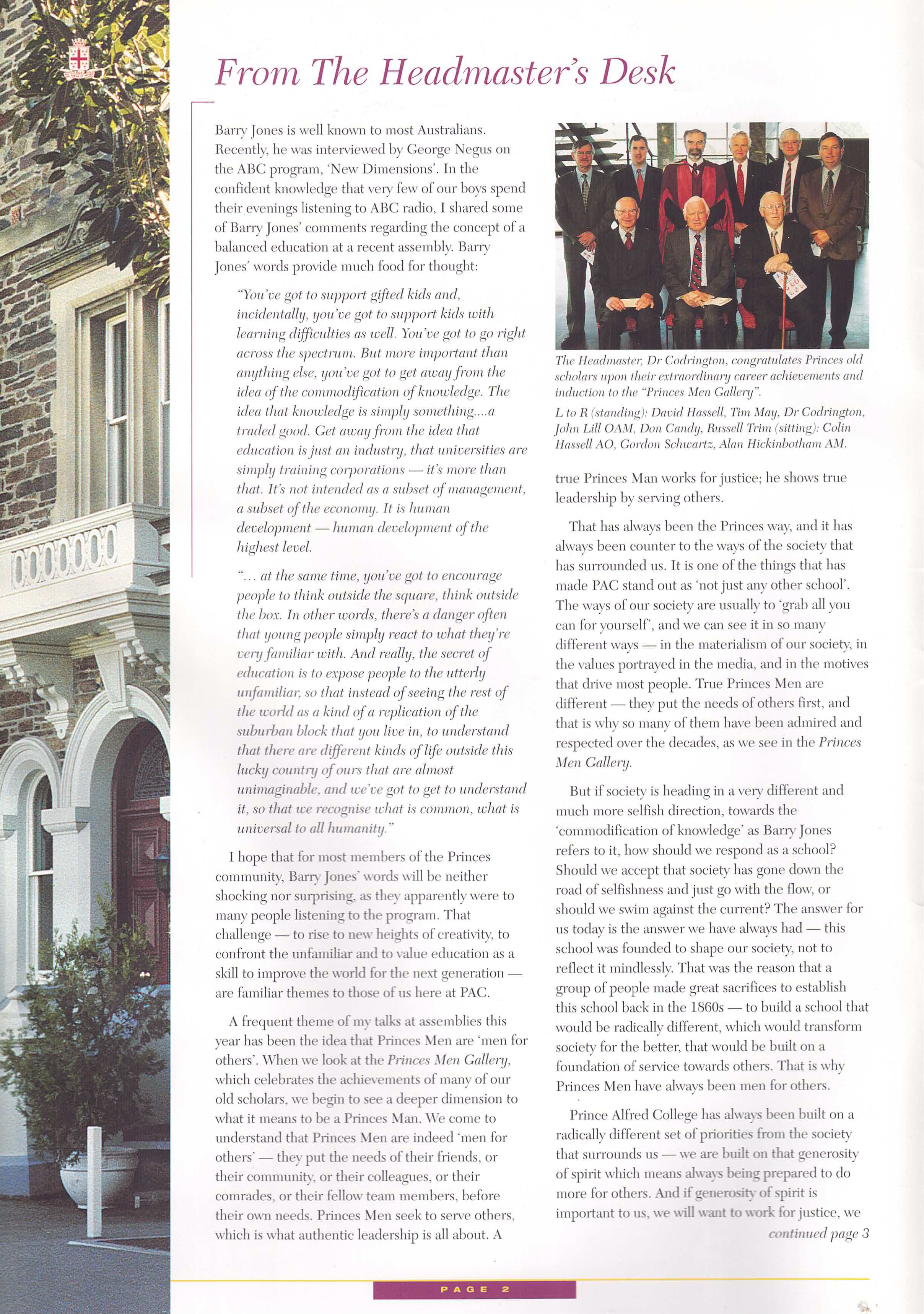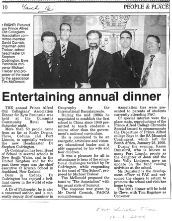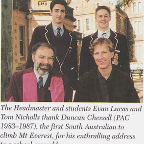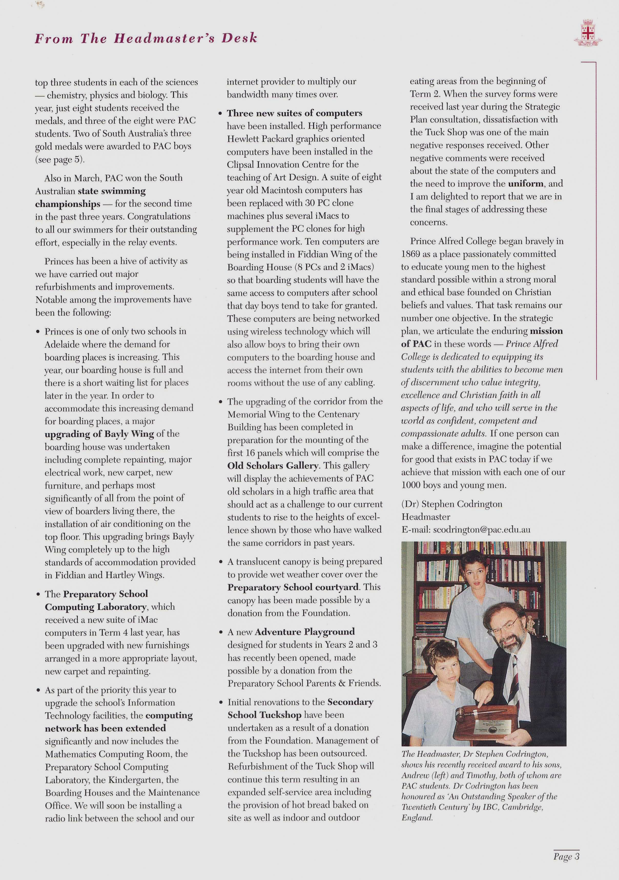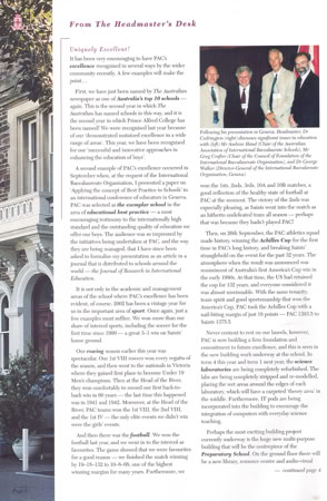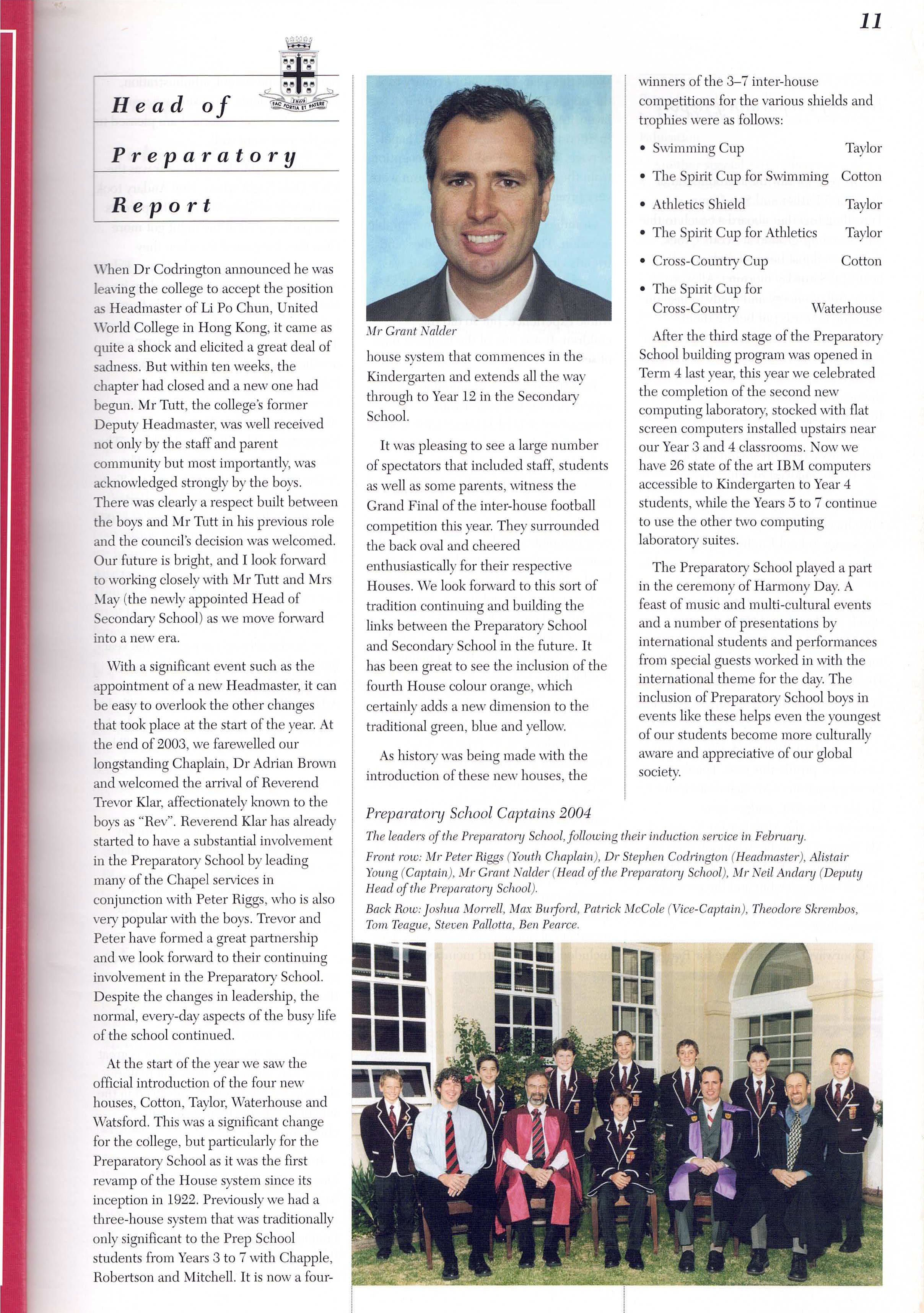 I was appointed as Prince Alfred College’s 9th Headmaster in late 1998, commencing duties on the first day of 2000. While at Prince Alfred College, one of Australia's most famous boys' schools (established in 1869), I oversaw a period of significant and rapid change. Many people would say this change was long overdue, dragging a somewhat conservative, inward-looking but well-meaning board and its excessively enmeshed finance staff out of the 20th into the 21st century. I was surprised by the poor state of many buildings (Library, Science Labs, Preparatory School) and educational shortcomings in the areas of limited languages program, anaemic support for the IB, no Gifted and Talented program, and sub-standard boarding facilities. One of my first initiatives was to commission the Milennium Hanging, a massive quilted hanging for the Hall that symbolised unity by assembling the handprint and signature of every student and staff member in the school on 1st January 2000. As soon as I arrived, I introduced a regular daily “Open Door” time for staff who were welcomed to come to my office unannounced to discuss any topic or question. I worked to build a strong relationship with PAOCA (Prince Alfred Old Collegians Association), travelling to attend almost every country and interstate reunion during my tenure as well as every one of the multiple reunions held in Adelaide. I oversaw three substantial building programs, upgraded classrooms (including introducing air conditioning), oversaw a complete re-fitting of the Hall with new seating, and played a pivotal role in developing the master plan which guided major campus redevelopment during the subsequent ten years. I diversified the staffing profile by appointing more young staff, including more women, and oversaw a much-needed growth in student enrolments of about 15% (Annual Reports show there were 909 students when I arrived in early 2000, 934 in early 2001, 952 in early 2002 and 963 in early 2003; by the end of 2003 there were 996 students). The strong growth of enrolments resulted from the appointment of an excellent new director in the Admissions Office who was supported by innovative marketing campaigns that controversially included television advertising and posters on bus shelters. I worked tirelessly to promote the College’s ethos as a Uniting Church school, including creating the new position of Youth Minister, through his weekly Newsletter articles, my public addresses and my weekly speeches at school assemblies. Always seeking to build new directions that authentically flowed from the College’s rich history and traditions, I actively ensured growth the School’s Archives facilities, developed a gallery called “Our Princes Men” in a high-traffic area of the school to celebrate the substantial achievements of alumni as role models to current students, initiated the Vintage Reds reunions to supplement the Old Old Boys annual assemblies, and commissioned historian and ex-student Ron Gibbs to update, expand and re-publish his 1984 “History of Prince Alfred College”. I promoted the school internationally, establishing a sister school relationship with Datong High School in Shanghai (China), personally recruiting several tens of students from China, and (less successfully) promoting the College at recruitment fairs in Russia and Eastern Europe. Throughout my time at Prince Alfred College, I chose to stay in touch with my students and with my teachers’ daily needs by teaching full regular classes of Geography. I developed and implemented a new Strategic Plan following extensive consultation, I developed a highly effective incentive awards program that stimulated student effort and achievement in the classroom, I established the Einstein Program to meet the needs of Gifted and Talented students, guided the formation of the Noel Baker Centre for School Mathematics, I saw every student individually in my office on their birthday, introduced leadership training camps for prefects, co-ordinated a significant and overdue updating of the school uniform, and I developed and introduced the nationally-acclaimed, ground-breaking Eudemology program. This last innovation was one of several that led to the school being named one of “Australia’s Top 10 Schools” by 'The Australian' newspaper during three years of the five years that I was there, something that has not been repeated by any school before or since. Upon leaving Prince Alfred College to take up a new headship in Hong Kong, I donated a new trophy, the Wesley Cup, as a peak award for the restructured annual house competition, becoming the College’s first Headmaster since 1886 to leave in order to take up another position (as opposed to retiring).
