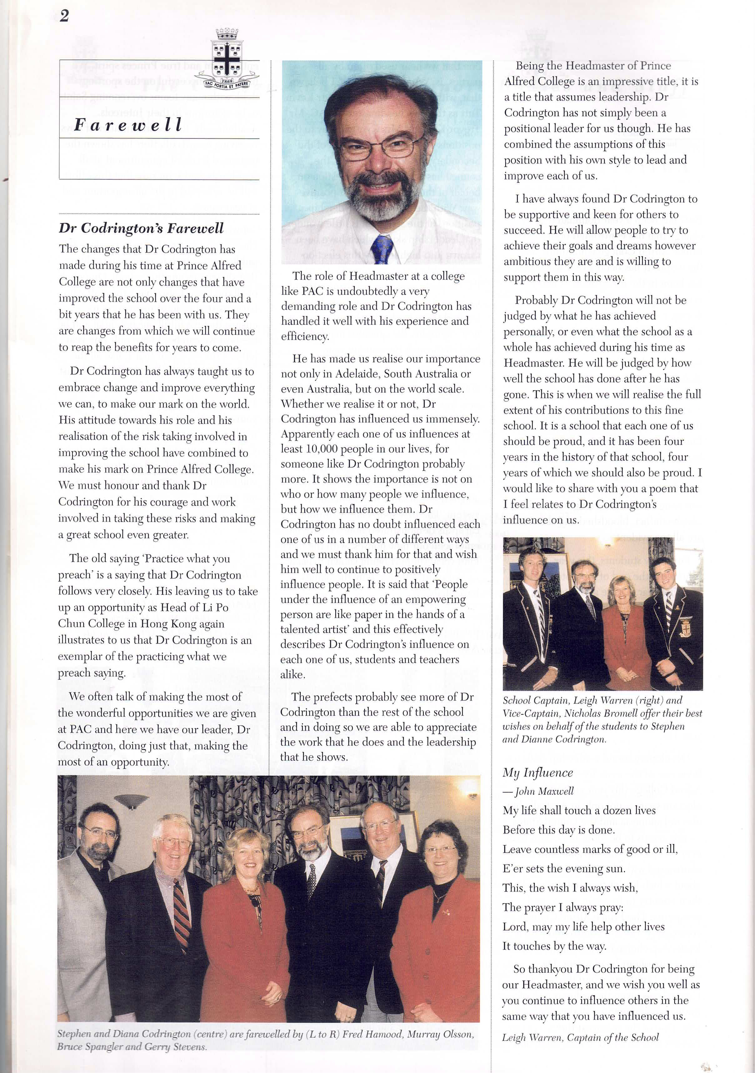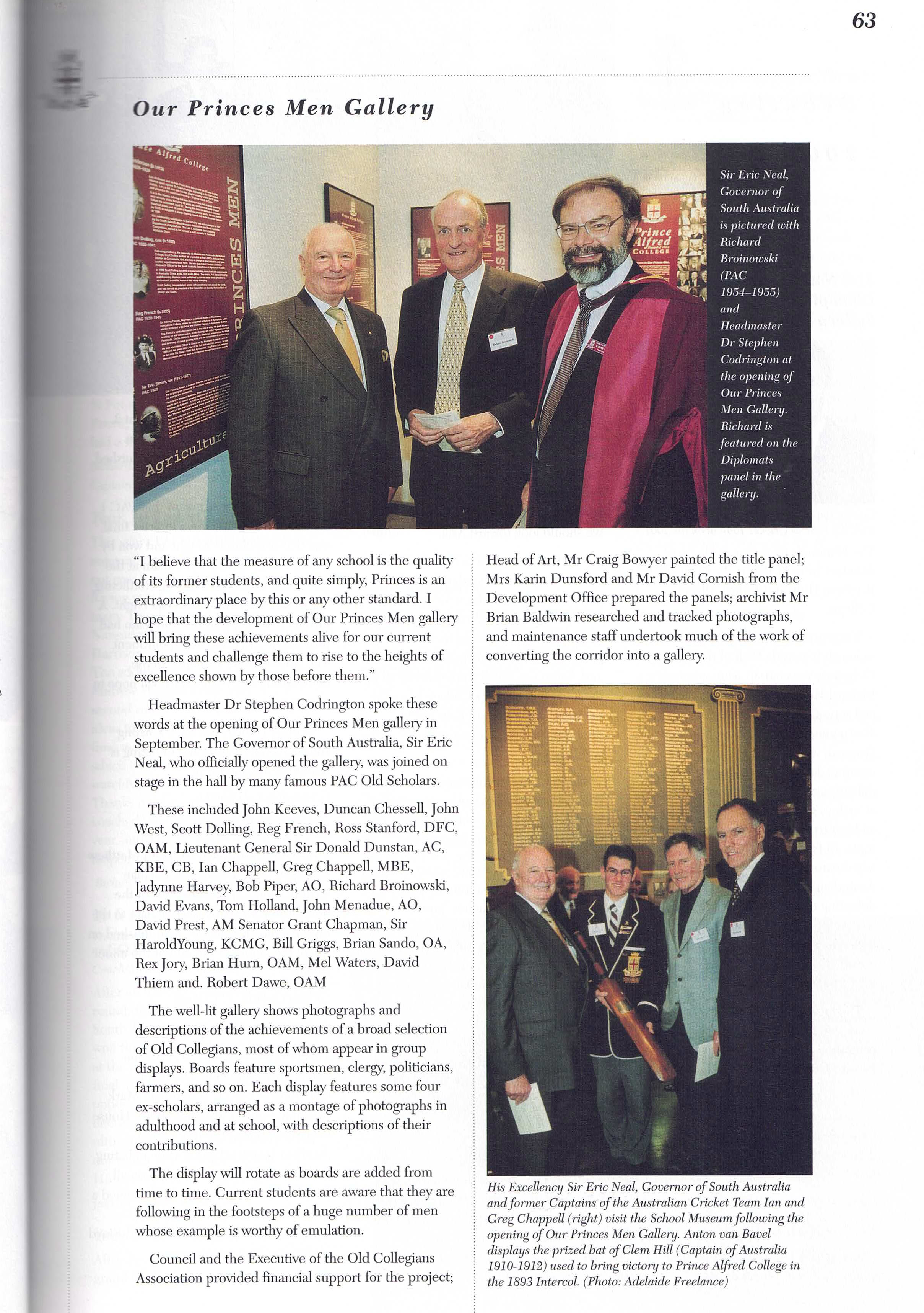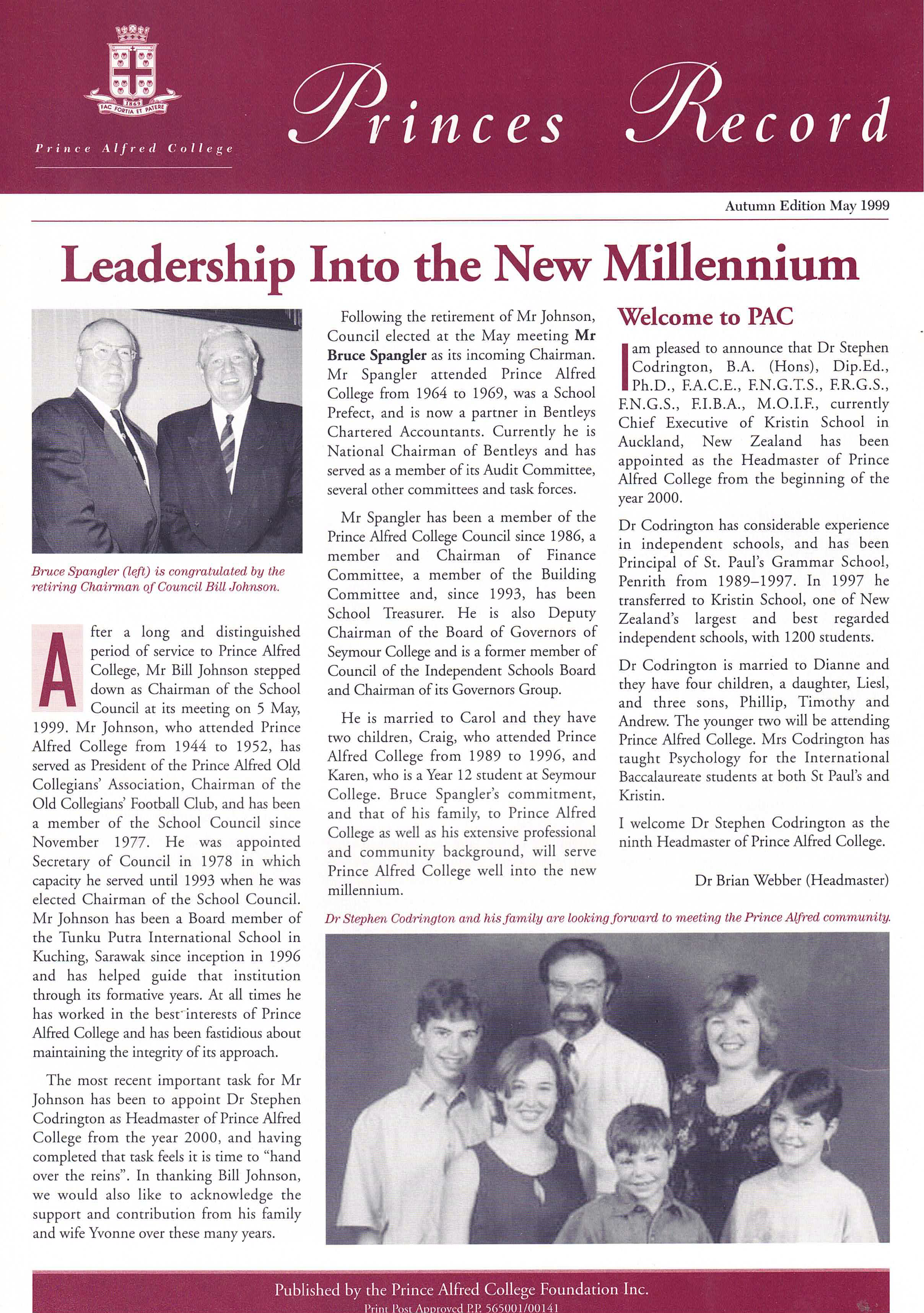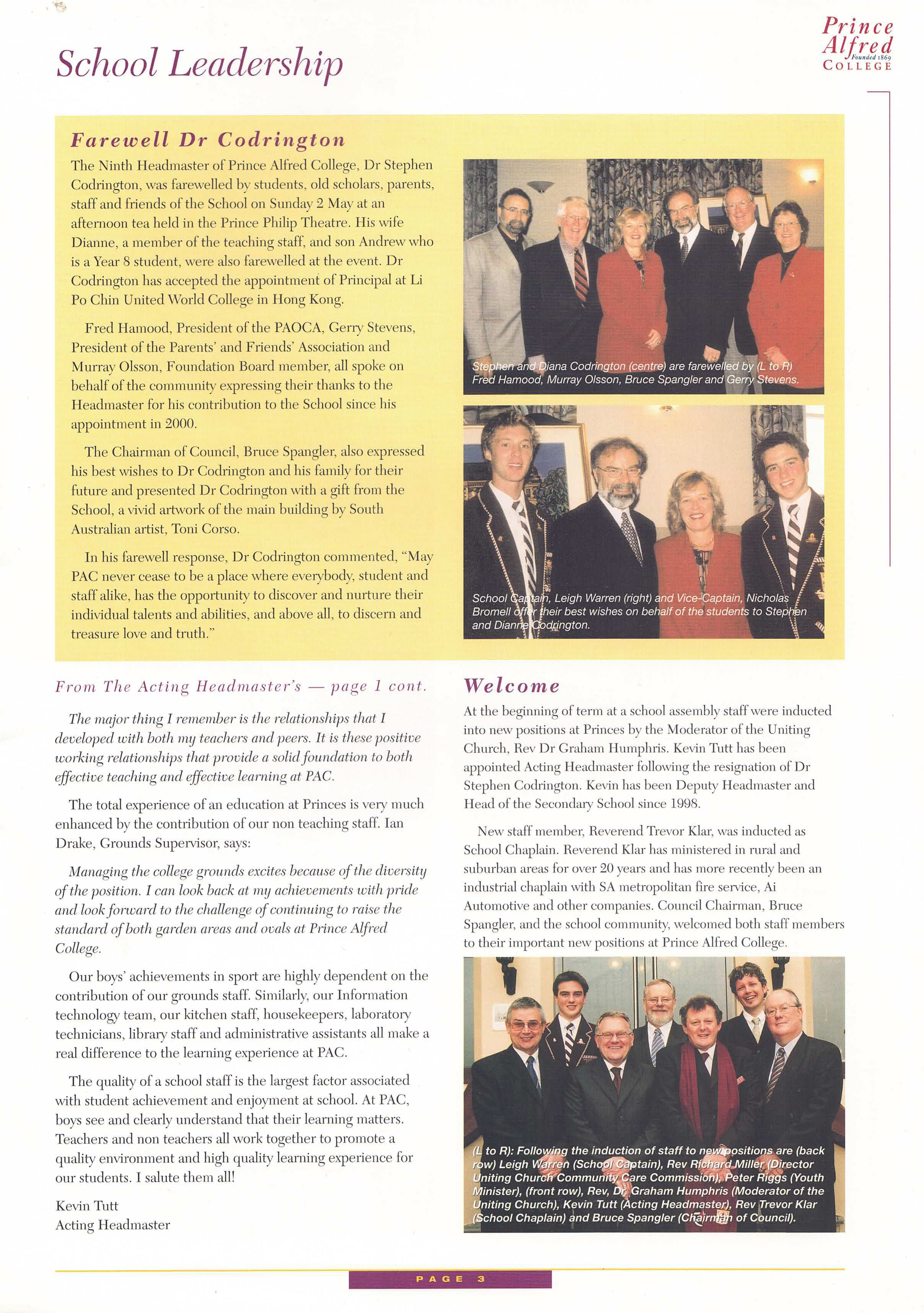 I was appointed as Prince Alfred College’s 9th Headmaster in late 1998, commencing duties on the first day of 2000. While at Prince Alfred College, one of Australia's most famous boys' schools (established in 1869), I oversaw a period of significant and rapid change. Many people would say this change was long overdue, dragging a somewhat conservative, inward-looking but well-meaning board and its excessively enmeshed finance staff out of the 20th into the 21st century. I was surprised by the poor state of many buildings (Library, Science Labs, Preparatory School) and educational shortcomings in the areas of limited languages program, anaemic support for the IB, no Gifted and Talented program, and sub-standard boarding facilities. One of my first initiatives was to commission the Milennium Hanging, a massive quilted hanging for the Hall that symbolised unity by assembling the handprint and signature of every student and staff member in the school on 1st January 2000. As soon as I arrived, I introduced a regular daily “Open Door” time for staff who were welcomed to come to my office unannounced to discuss any topic or question. I worked to build a strong relationship with PAOCA (Prince Alfred Old Collegians Association), travelling to attend almost every country and interstate reunion during my tenure as well as every one of the multiple reunions held in Adelaide. I oversaw three substantial building programs, upgraded classrooms (including introducing air conditioning), oversaw a complete re-fitting of the Hall with new seating, and played a pivotal role in developing the master plan which guided major campus redevelopment during the subsequent ten years. I diversified the staffing profile by appointing more young staff, including more women, and oversaw a much-needed growth in student enrolments of about 15% (Annual Reports show there were 909 students when I arrived in early 2000, 934 in early 2001, 952 in early 2002 and 963 in early 2003; by the end of 2003 there were 996 students). The strong growth of enrolments resulted from the appointment of an excellent new director in the Admissions Office who was supported by innovative marketing campaigns that controversially included television advertising and posters on bus shelters. I worked tirelessly to promote the College’s ethos as a Uniting Church school, including creating the new position of Youth Minister, through his weekly Newsletter articles, my public addresses and my weekly speeches at school assemblies. Always seeking to build new directions that authentically flowed from the College’s rich history and traditions, I actively ensured growth the School’s Archives facilities, developed a gallery called “Our Princes Men” in a high-traffic area of the school to celebrate the substantial achievements of alumni as role models to current students, initiated the Vintage Reds reunions to supplement the Old Old Boys annual assemblies, and commissioned historian and ex-student Ron Gibbs to update, expand and re-publish his 1984 “History of Prince Alfred College”. I promoted the school internationally, establishing a sister school relationship with Datong High School in Shanghai (China), personally recruiting several tens of students from China, and (less successfully) promoting the College at recruitment fairs in Russia and Eastern Europe. Throughout my time at Prince Alfred College, I chose to stay in touch with my students and with my teachers’ daily needs by teaching full regular classes of Geography. I developed and implemented a new Strategic Plan following extensive consultation, I developed a highly effective incentive awards program that stimulated student effort and achievement in the classroom, I established the Einstein Program to meet the needs of Gifted and Talented students, guided the formation of the Noel Baker Centre for School Mathematics, I saw every student individually in my office on their birthday, introduced leadership training camps for prefects, co-ordinated a significant and overdue updating of the school uniform, and I developed and introduced the nationally-acclaimed, ground-breaking Eudemology program. This last innovation was one of several that led to the school being named one of “Australia’s Top 10 Schools” by 'The Australian' newspaper during three years of the five years that I was there, something that has not been repeated by any school before or since. Upon leaving Prince Alfred College to take up a new headship in Hong Kong, I donated a new trophy, the Wesley Cup, as a peak award for the restructured annual house competition, becoming the College’s first Headmaster since 1886 to leave in order to take up another position (as opposed to retiring).