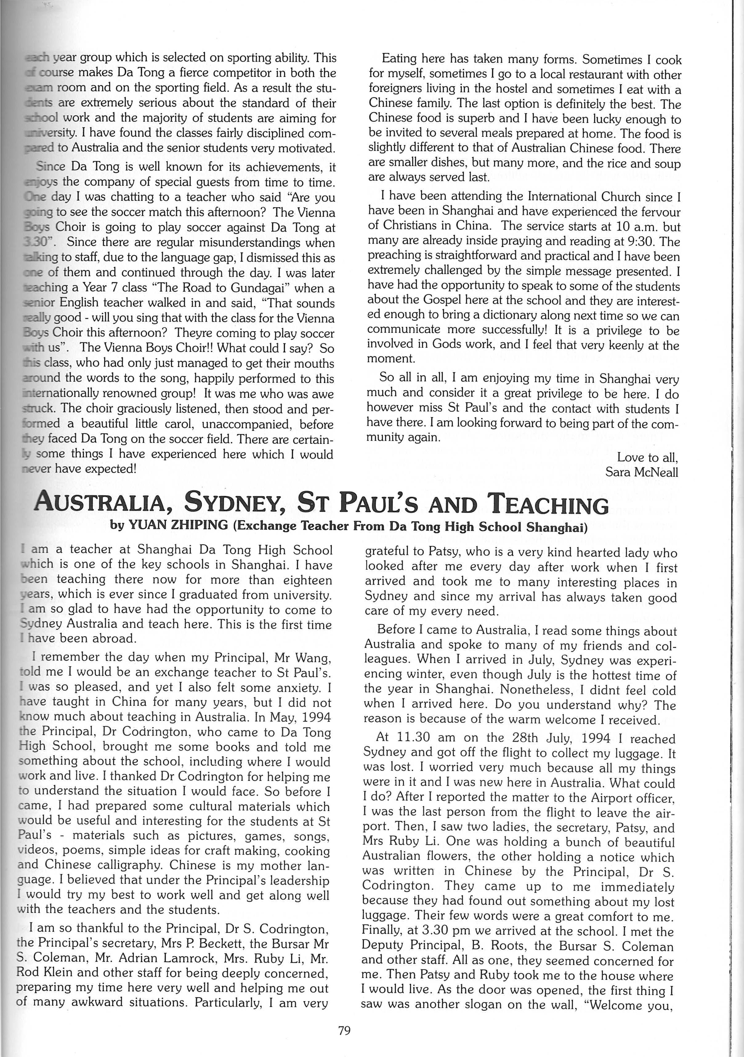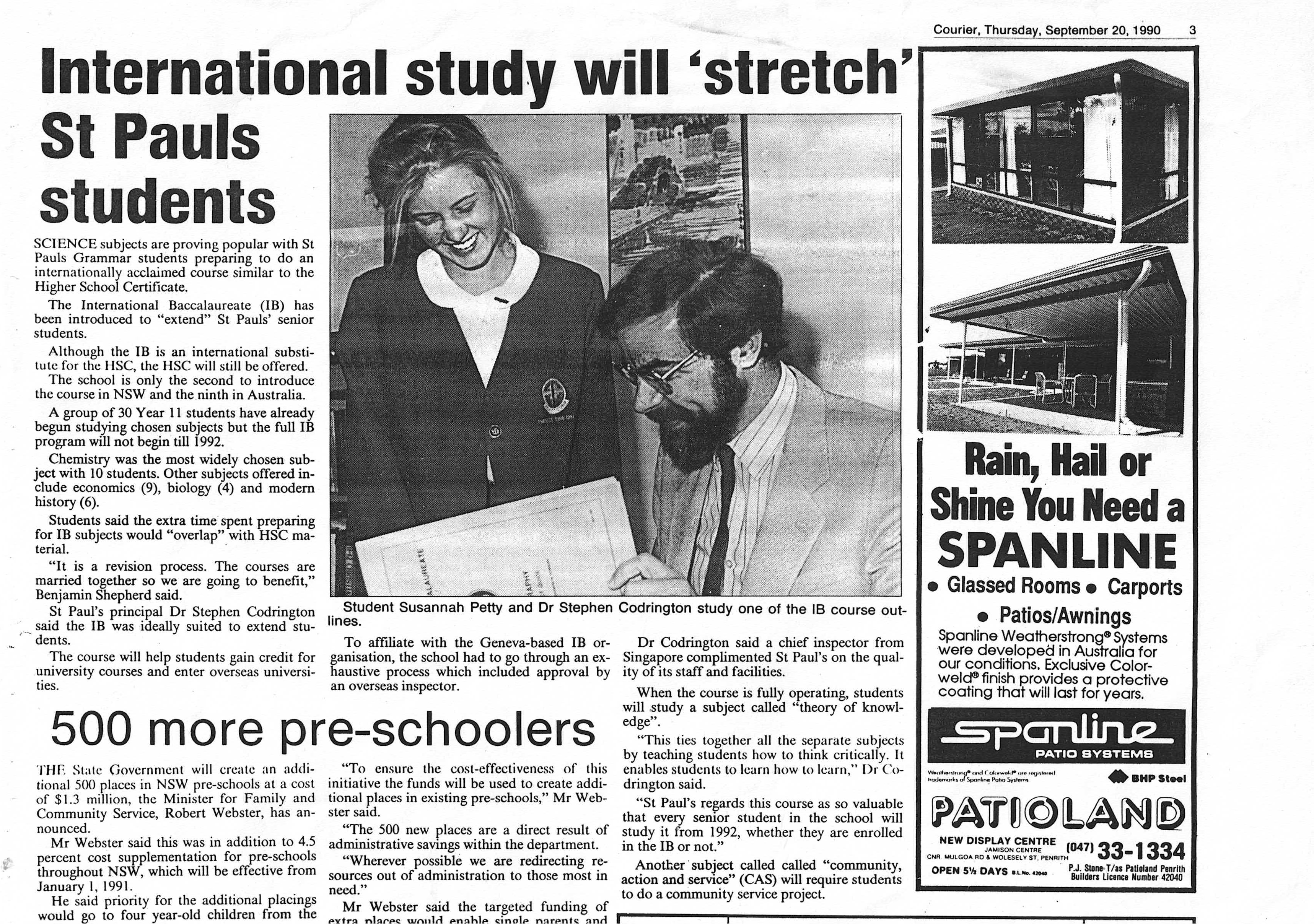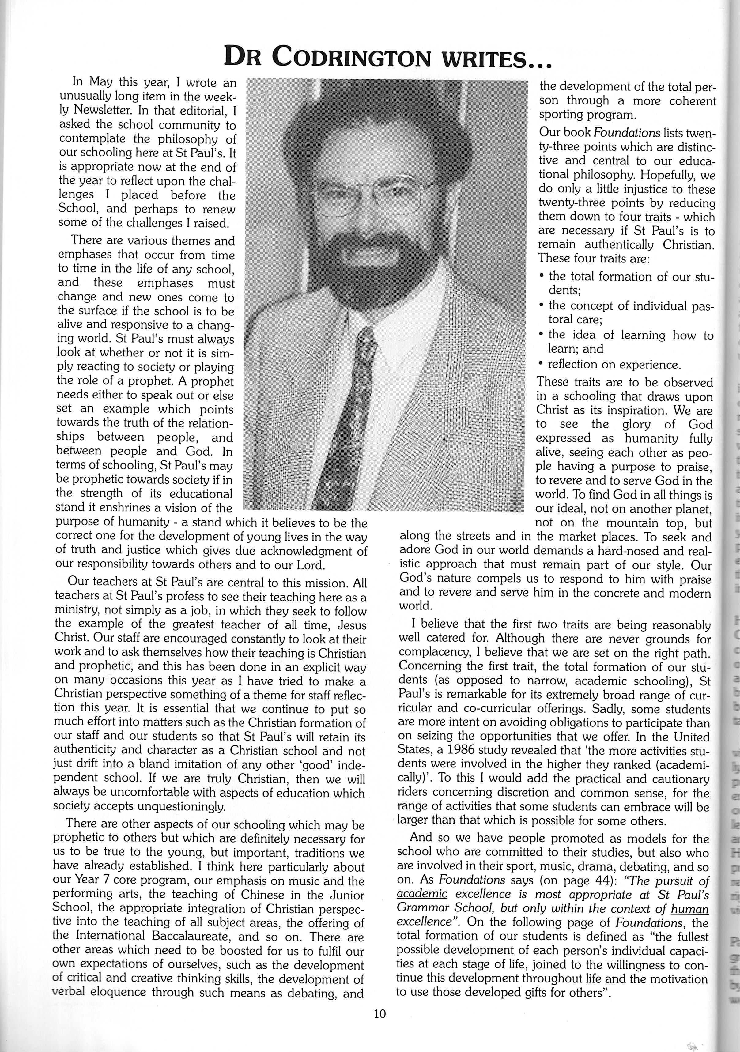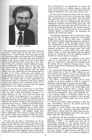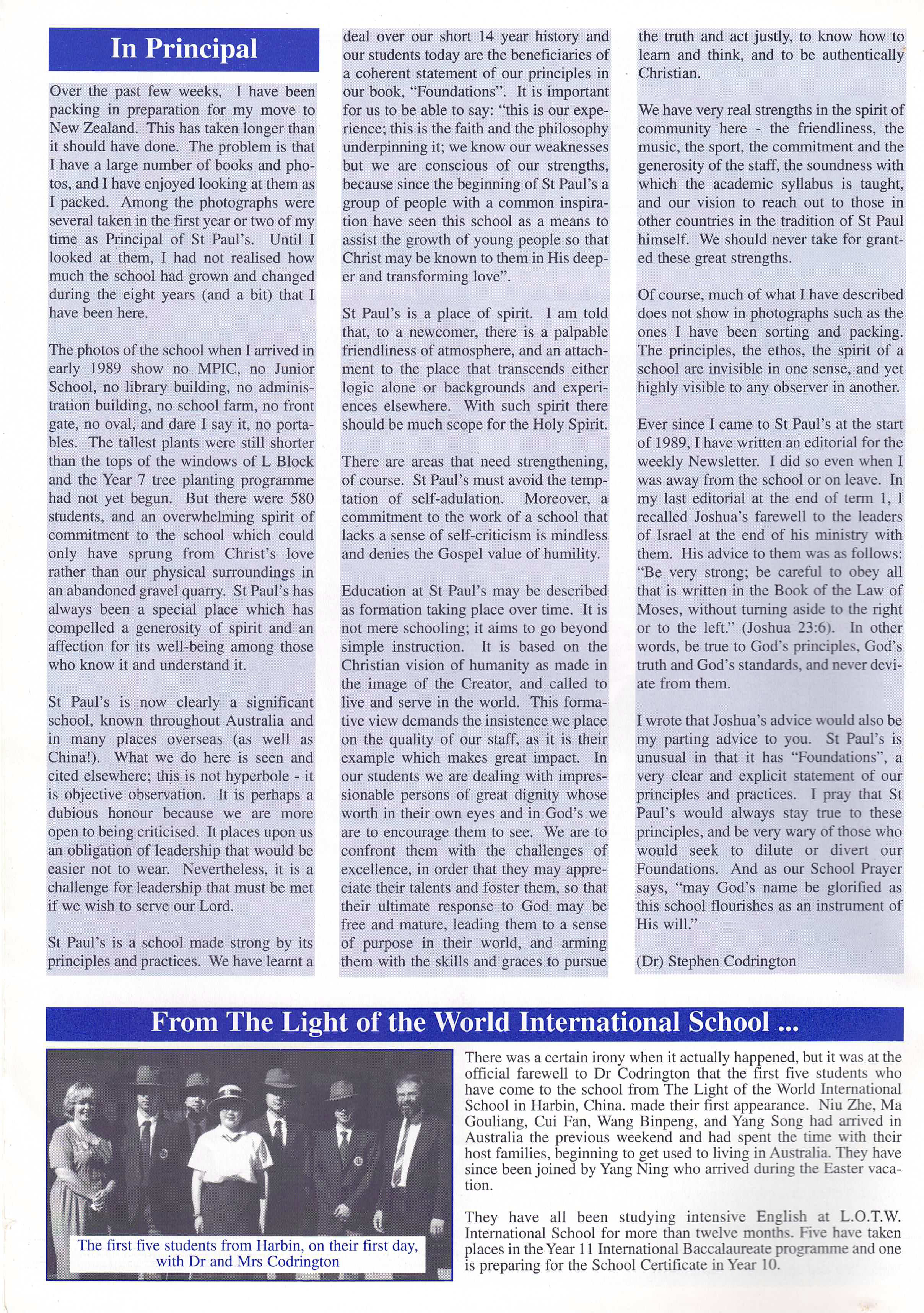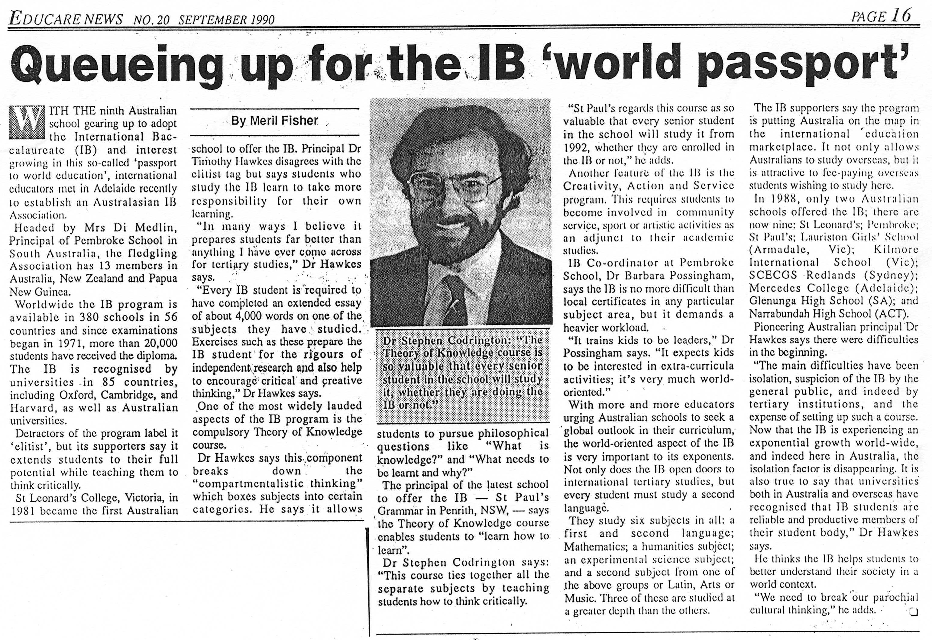 I came to St Paul’s when the school was six years old as its third Principal. Under my eight years of headship, the school expanded from being a high school (Years 7-12) with 500 students into a full K-12 school with over 1200 students with the establishment of a Junior School on the campus (K-6). The Junior School quickly gained an impressive reputation for high standards and innovation, including compulsory teaching of Chinese language from Kindergarten to Year 6. To accommodate the expansion of student numbers, I guided six large building programs, two of which involved innovative and highly acclaimed adobe (mud-brick) construction. I worked to build a strong, cohesive community in the school, including inviting each student to visit my office for an individual chat on their birthday, editing the 10th anniversary book “The First of Many Decades”, and writing the school’s first definitive statement of philosophy and educational principles, the book “Foundations”. I gained membership of the school in several significant peak ‘mainstream’ networking organisations including AHISA and HMC, and worked successfully to make St Paul’s a founding member of HICES. I introduced a Gifted and Talented program that included then-innovative practices including acceleration and vertical streaming. I demonstrated creativity, patience and negotiating skills by successfully negotiating and establishing a joint-venture branch of the school in Harbin (north-east China), a task that involved sorting through a myriad of legal, governmental and regulatory hurdles, as well as demonstrating a deep level of cultural sensitivity. I also introduced the IB Diploma in 1990 – a bravely pioneering step way at the time as the IB was largely unknown in Australia at the time – St Paul’s was only the second IB school in New South Wales and the first in the state to offer examinations in the November session. Internationalism became a key feature of the school under my leadership, supported by his establishment of sister school relationships with schools in China, Japan and Russia. With the support of the School Council, I established the Development Office, bringing back Adrian Lamrock (the School’s Founding Principal) as its first director; Adrian subsequently raised significant sums for capital building projects as well as inaugurating annual school musical productions and starting the regular magazine “Futurum”. Also with the Council’s support, I established annual scholarships, and I played a strong role in the successful local campaign to reverse a government proposal to establish a huge rubbish tip just along the road from the school. Apparently I am also especially remembered for my introduction of a system of student awards for effort that positively transformed the learning ethos of the student body. Throughout my time at St Paul’s, I chose to stay in touch with my students and with my teachers’ daily needs by teaching full regular classes of Geography.