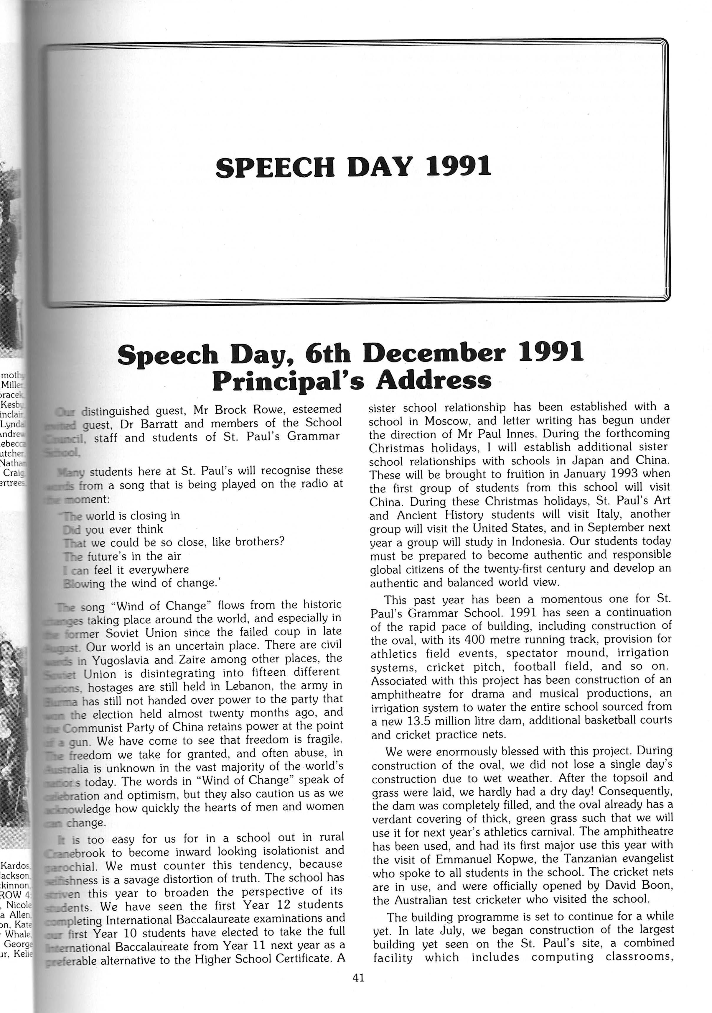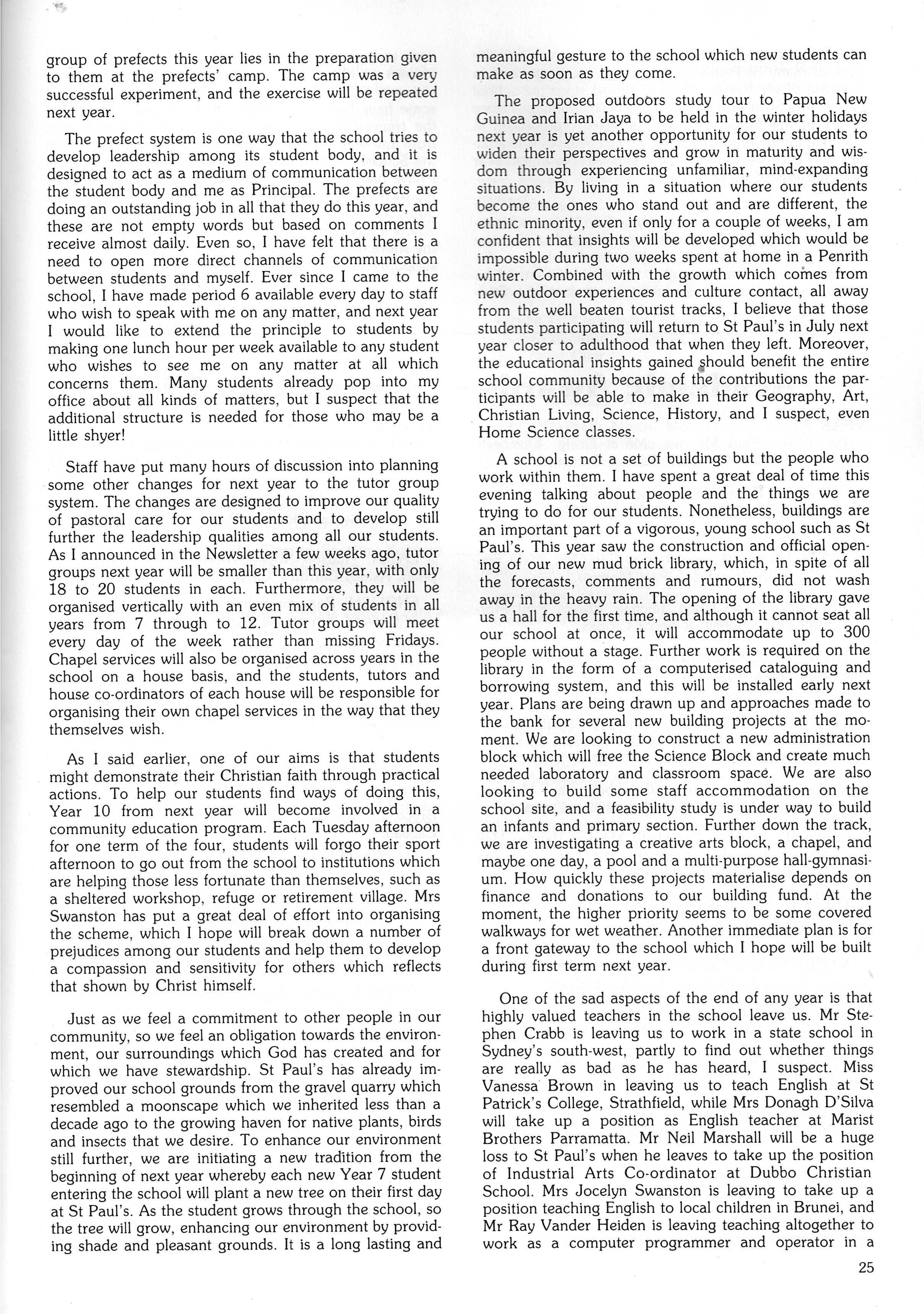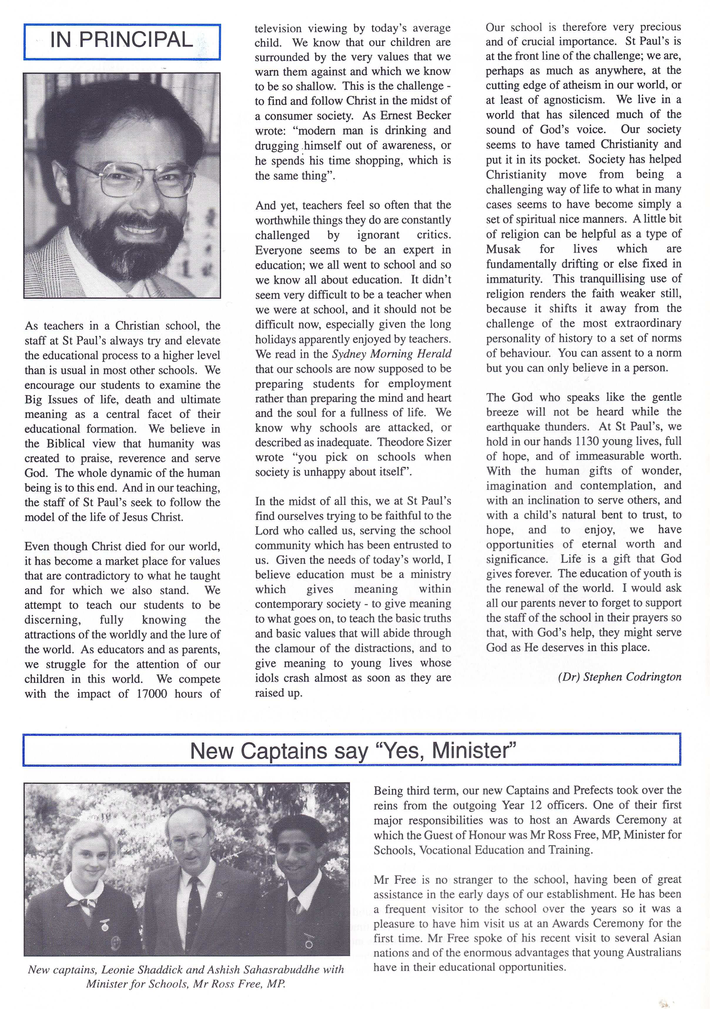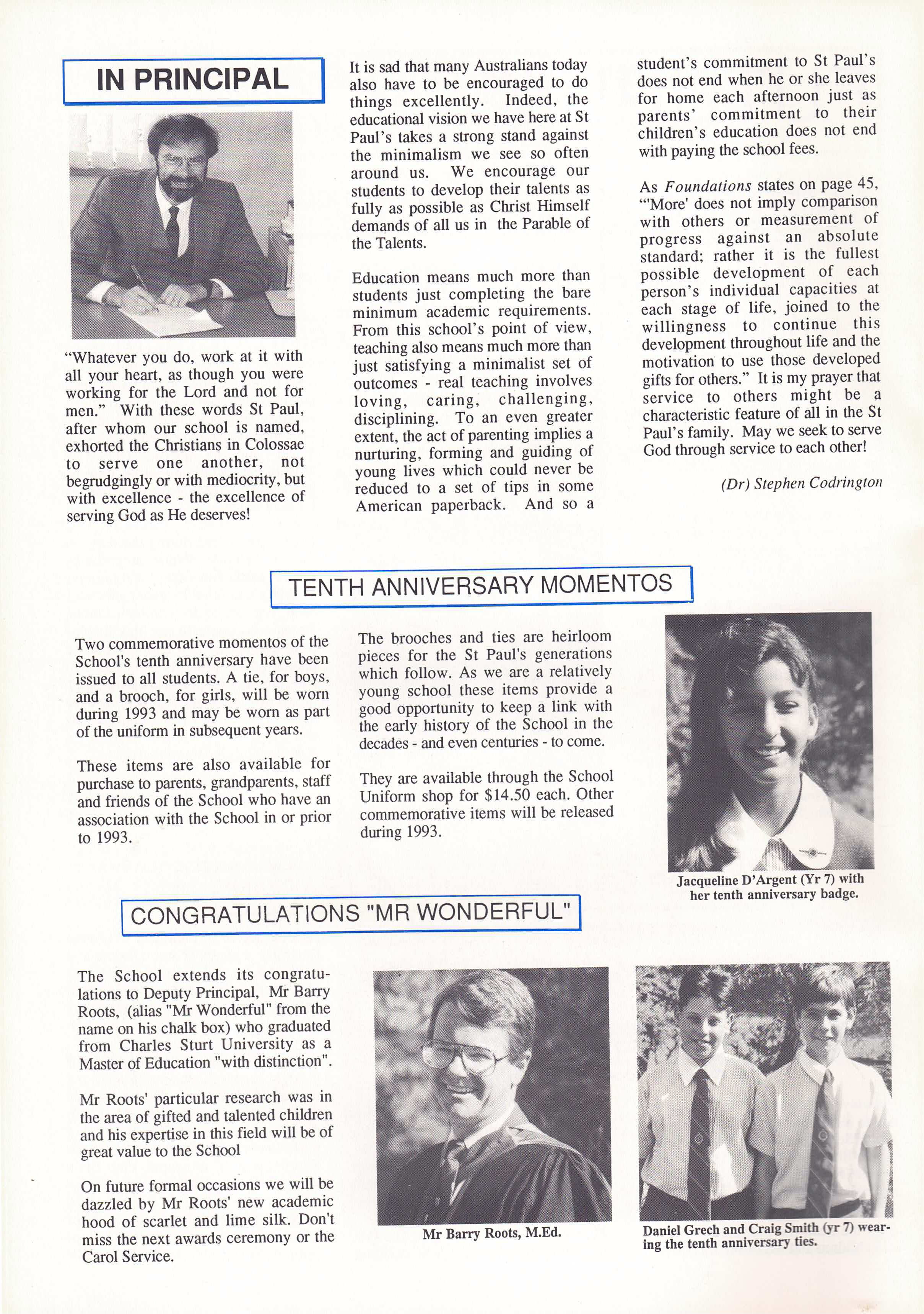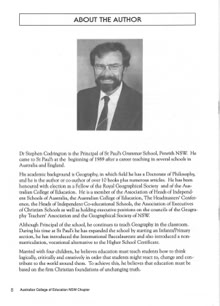 I came to St Paul’s when the school was six years old as its third Principal. Under my eight years of headship, the school expanded from being a high school (Years 7-12) with 500 students into a full K-12 school with over 1200 students with the establishment of a Junior School on the campus (K-6). The Junior School quickly gained an impressive reputation for high standards and innovation, including compulsory teaching of Chinese language from Kindergarten to Year 6. To accommodate the expansion of student numbers, I guided six large building programs, two of which involved innovative and highly acclaimed adobe (mud-brick) construction. I worked to build a strong, cohesive community in the school, including inviting each student to visit my office for an individual chat on their birthday, editing the 10th anniversary book “The First of Many Decades”, and writing the school’s first definitive statement of philosophy and educational principles, the book “Foundations”. I gained membership of the school in several significant peak ‘mainstream’ networking organisations including AHISA and HMC, and worked successfully to make St Paul’s a founding member of HICES. I introduced a Gifted and Talented program that included then-innovative practices including acceleration and vertical streaming. I demonstrated creativity, patience and negotiating skills by successfully negotiating and establishing a joint-venture branch of the school in Harbin (north-east China), a task that involved sorting through a myriad of legal, governmental and regulatory hurdles, as well as demonstrating a deep level of cultural sensitivity. I also introduced the IB Diploma in 1990 – a bravely pioneering step way at the time as the IB was largely unknown in Australia at the time – St Paul’s was only the second IB school in New South Wales and the first in the state to offer examinations in the November session. Internationalism became a key feature of the school under my leadership, supported by his establishment of sister school relationships with schools in China, Japan and Russia. With the support of the School Council, I established the Development Office, bringing back Adrian Lamrock (the School’s Founding Principal) as its first director; Adrian subsequently raised significant sums for capital building projects as well as inaugurating annual school musical productions and starting the regular magazine “Futurum”. Also with the Council’s support, I established annual scholarships, and I played a strong role in the successful local campaign to reverse a government proposal to establish a huge rubbish tip just along the road from the school. Apparently I am also especially remembered for my introduction of a system of student awards for effort that positively transformed the learning ethos of the student body. Throughout my time at St Paul’s, I chose to stay in touch with my students and with my teachers’ daily needs by teaching full regular classes of Geography.