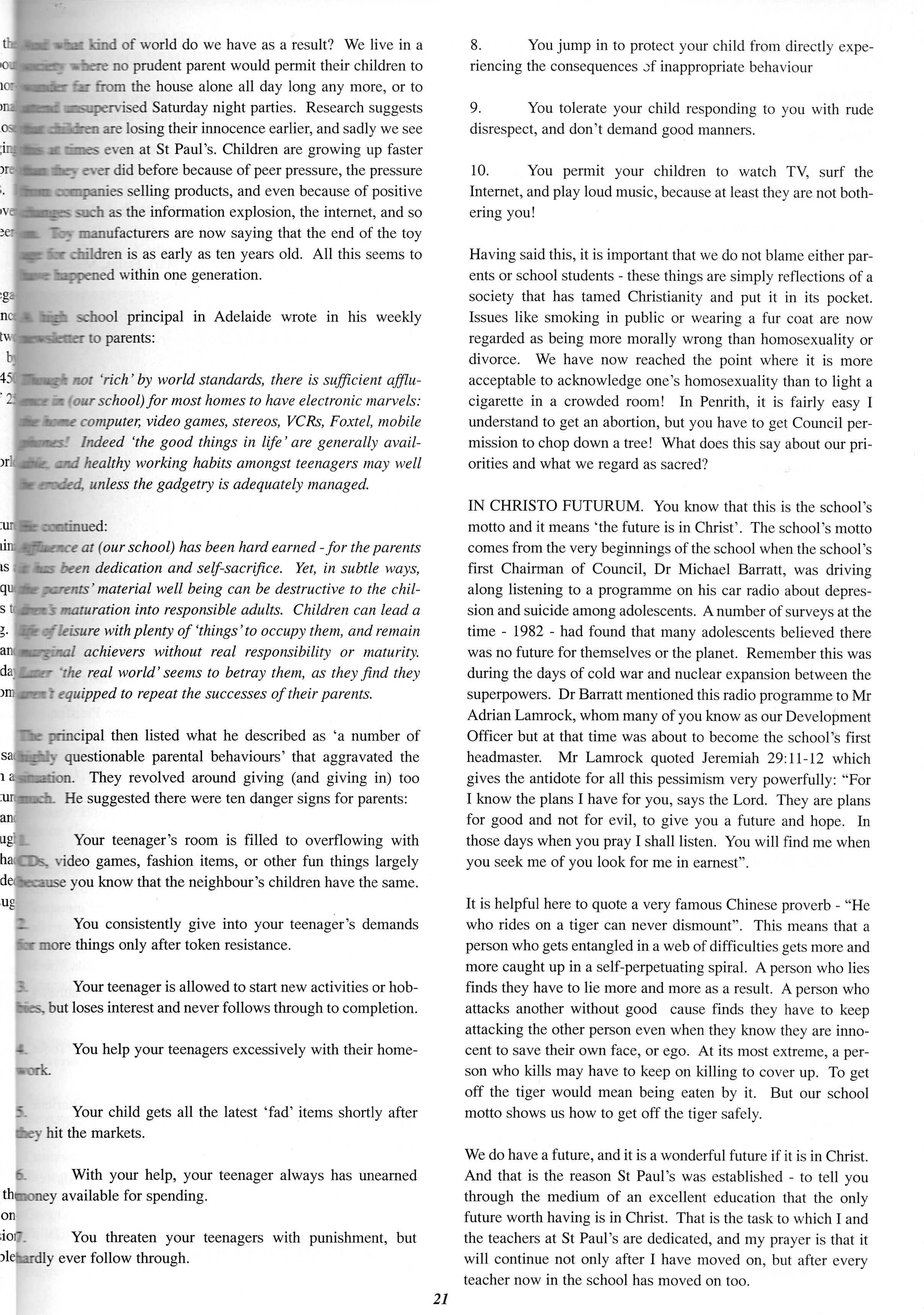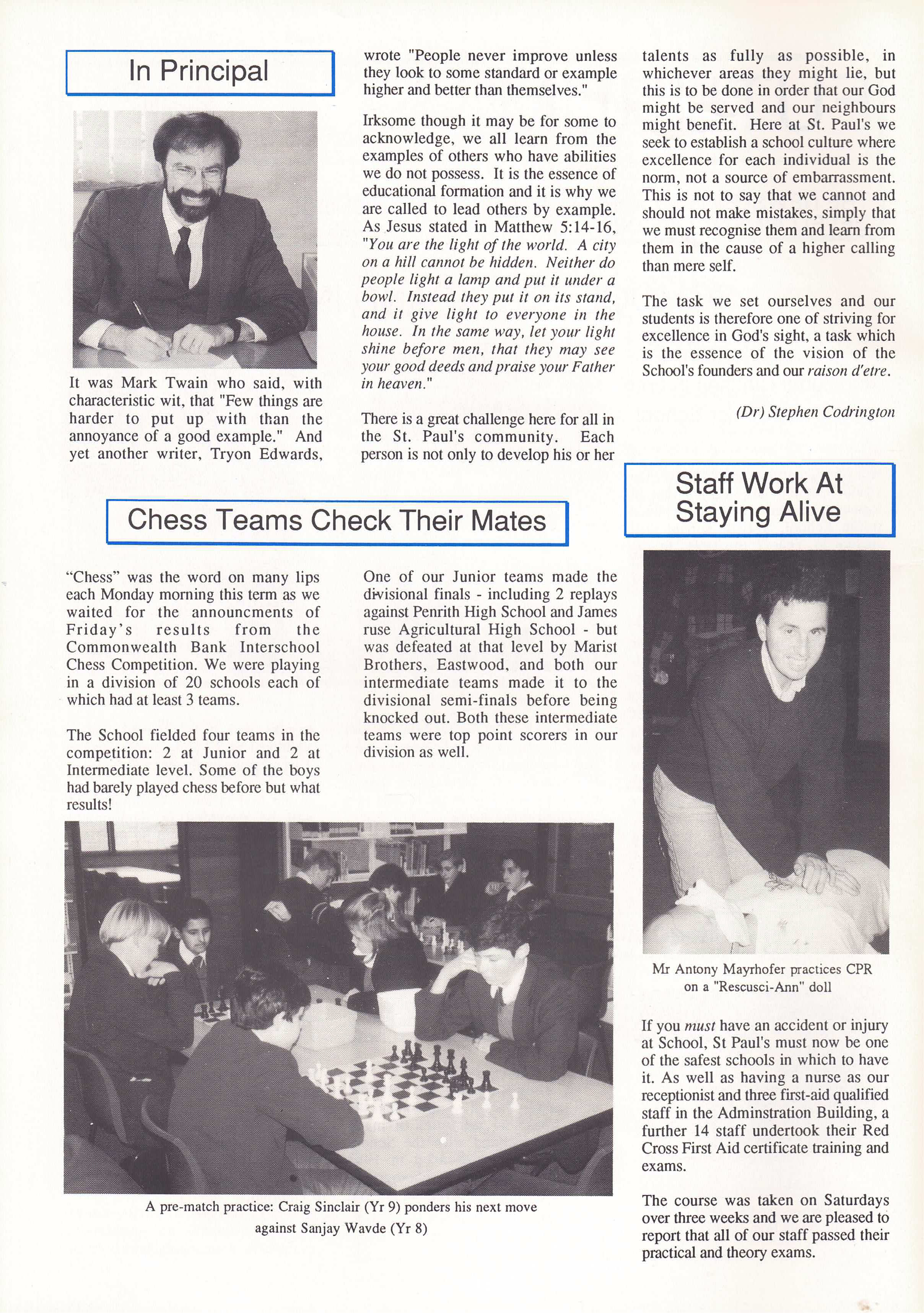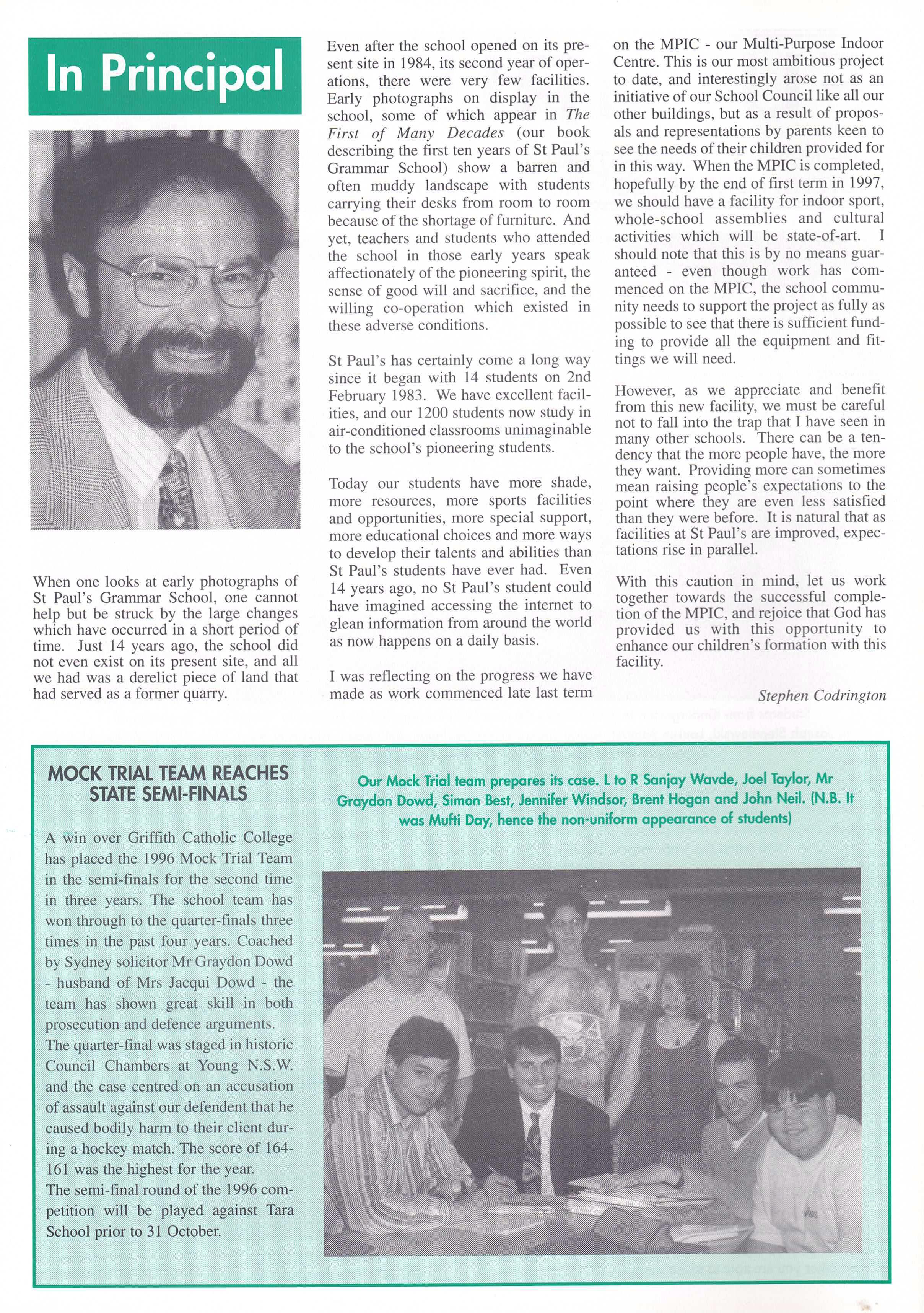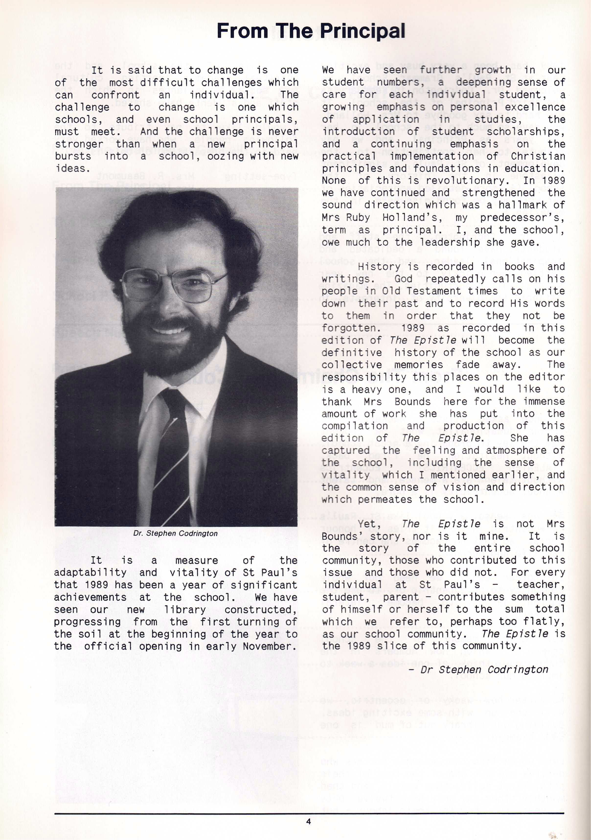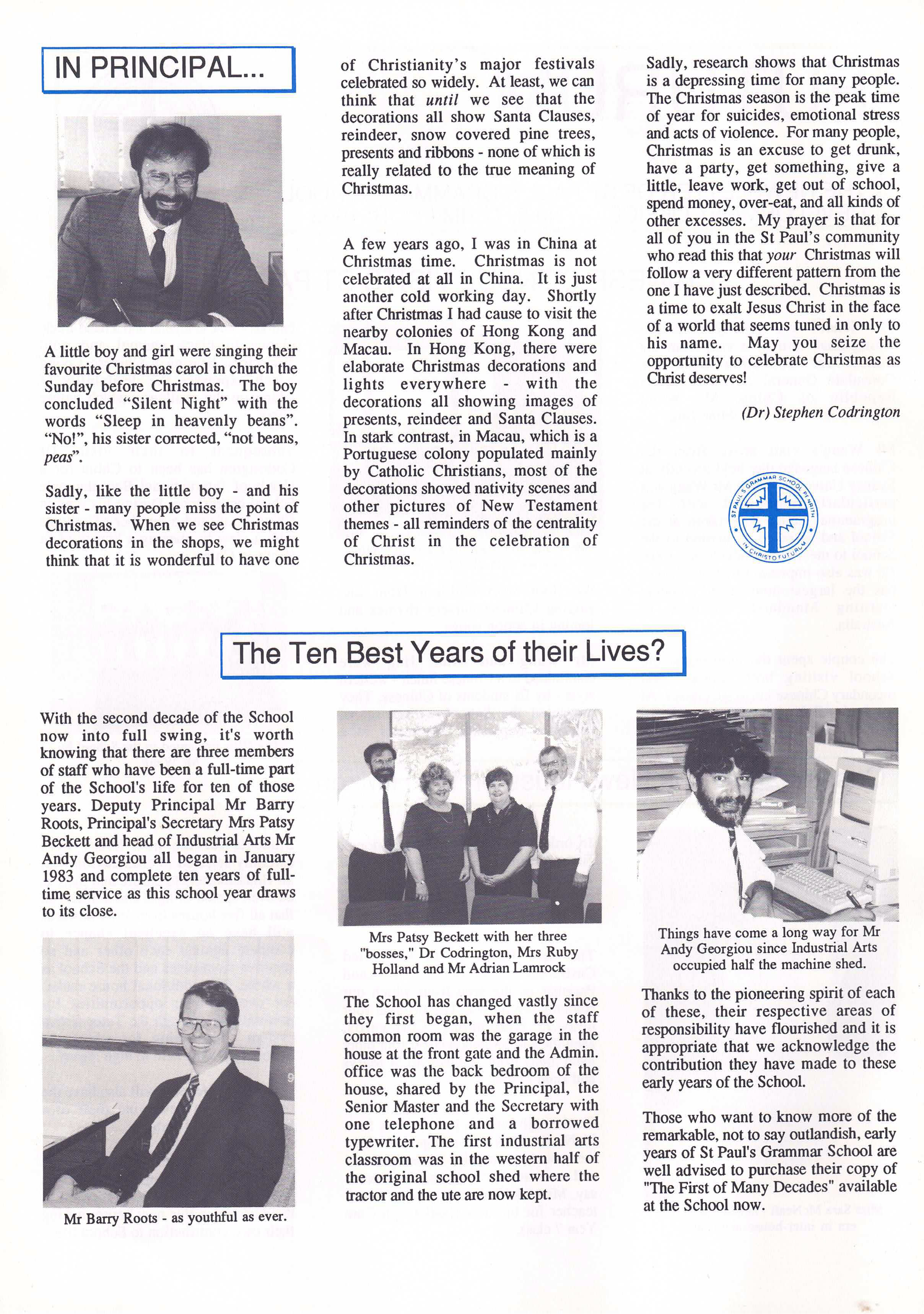 I came to St Paul’s when the school was six years old as its third Principal. Under my eight years of headship, the school expanded from being a high school (Years 7-12) with 500 students into a full K-12 school with over 1200 students with the establishment of a Junior School on the campus (K-6). The Junior School quickly gained an impressive reputation for high standards and innovation, including compulsory teaching of Chinese language from Kindergarten to Year 6. To accommodate the expansion of student numbers, I guided six large building programs, two of which involved innovative and highly acclaimed adobe (mud-brick) construction. I worked to build a strong, cohesive community in the school, including inviting each student to visit my office for an individual chat on their birthday, editing the 10th anniversary book “The First of Many Decades”, and writing the school’s first definitive statement of philosophy and educational principles, the book “Foundations”. I gained membership of the school in several significant peak ‘mainstream’ networking organisations including AHISA and HMC, and worked successfully to make St Paul’s a founding member of HICES. I introduced a Gifted and Talented program that included then-innovative practices including acceleration and vertical streaming. I demonstrated creativity, patience and negotiating skills by successfully negotiating and establishing a joint-venture branch of the school in Harbin (north-east China), a task that involved sorting through a myriad of legal, governmental and regulatory hurdles, as well as demonstrating a deep level of cultural sensitivity. I also introduced the IB Diploma in 1990 – a bravely pioneering step way at the time as the IB was largely unknown in Australia at the time – St Paul’s was only the second IB school in New South Wales and the first in the state to offer examinations in the November session. Internationalism became a key feature of the school under my leadership, supported by his establishment of sister school relationships with schools in China, Japan and Russia. With the support of the School Council, I established the Development Office, bringing back Adrian Lamrock (the School’s Founding Principal) as its first director; Adrian subsequently raised significant sums for capital building projects as well as inaugurating annual school musical productions and starting the regular magazine “Futurum”. Also with the Council’s support, I established annual scholarships, and I played a strong role in the successful local campaign to reverse a government proposal to establish a huge rubbish tip just along the road from the school. Apparently I am also especially remembered for my introduction of a system of student awards for effort that positively transformed the learning ethos of the student body. Throughout my time at St Paul’s, I chose to stay in touch with my students and with my teachers’ daily needs by teaching full regular classes of Geography.